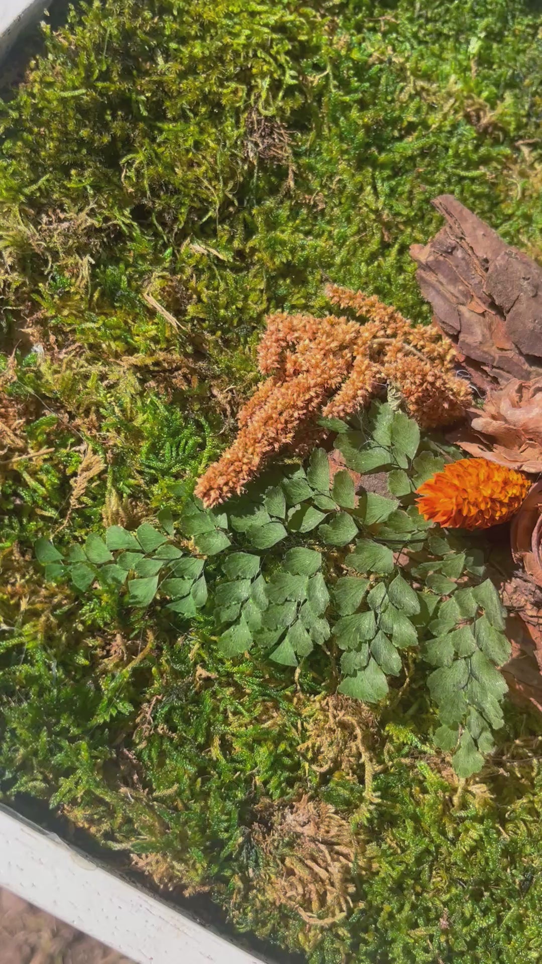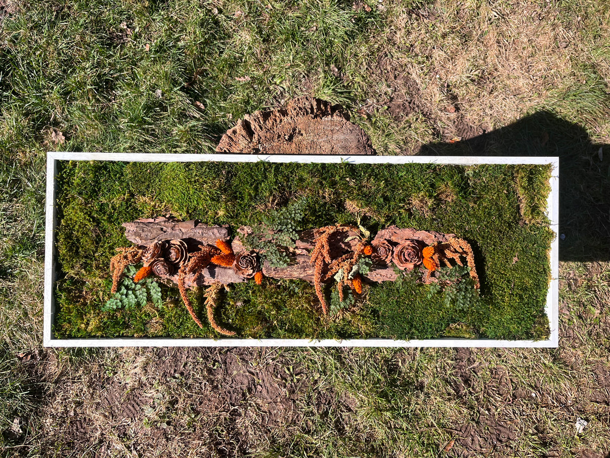 • Cadre mural constituer principalement dans les teintes de orange et de bois.Il est composé de mousse plate verte, d'écorce et de fleurs en bois accompagné avec de la fougère, des amarante et de Phalaris
